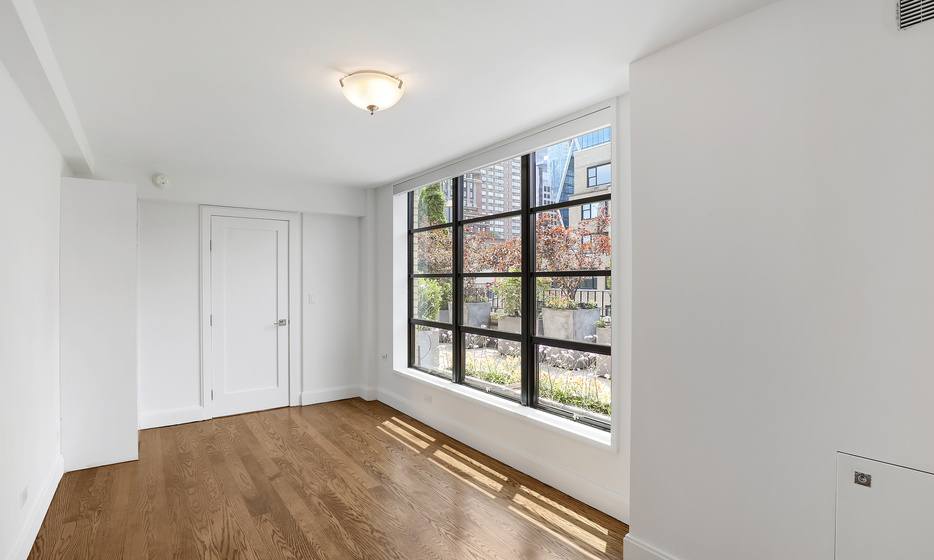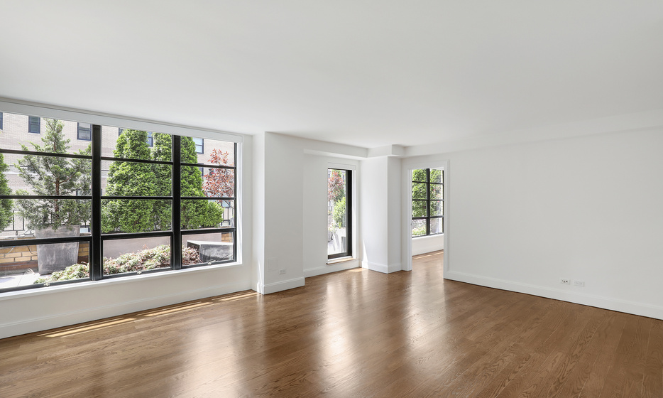 The contemporary chef’s kitchen is thoughtfully designed with sleek custom cabinetry, high-end Wolf and Sub-Zero appliances, and generous counter space. Adjacent to the kitchen, the living area is complemented by oak plank flooring, seamlessly connecting to the oversized terrace for effortless indoor-outdoor living.