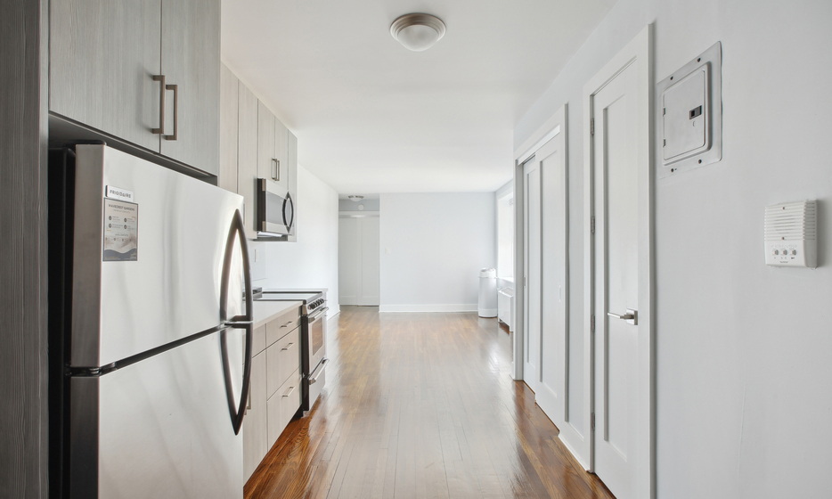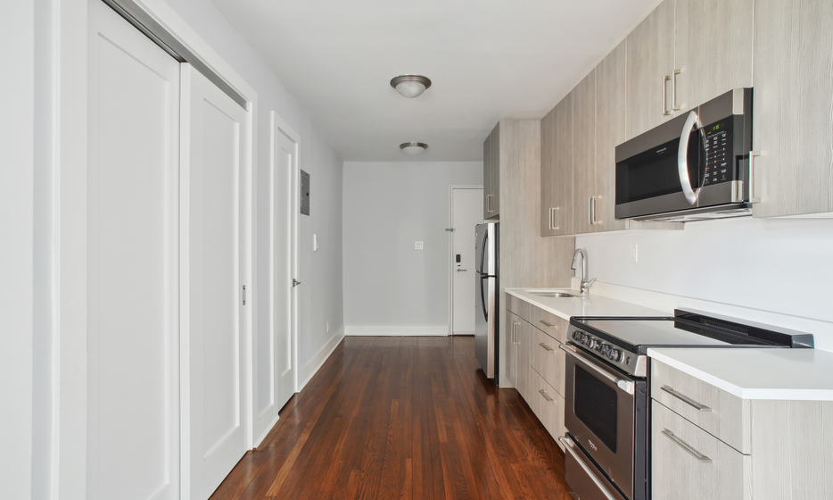 Spacious studio, 1 bathroom apartment. This apartment features a renovated kitchen with white caesarstone countertops, custom cabinetry, and stainless steel appliances.